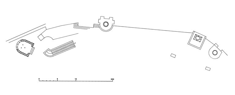 - De 4 positions de pièces (avec plate-forme) en béton, limitées à l'avant par un mur de genouillère courbe en béton armé soutenant les terres d'un glacis à contre pente et latéralement par les parois extérieures des traverses. Dans le sol, restes des boulons des sellettes