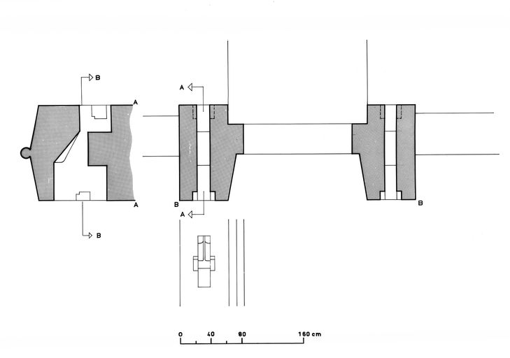 La première plateforme de pièce diffère légèrement des autres : rentrant concave du mur de genouillère coupé par un mur de maçonnerie et comblé.