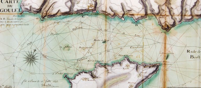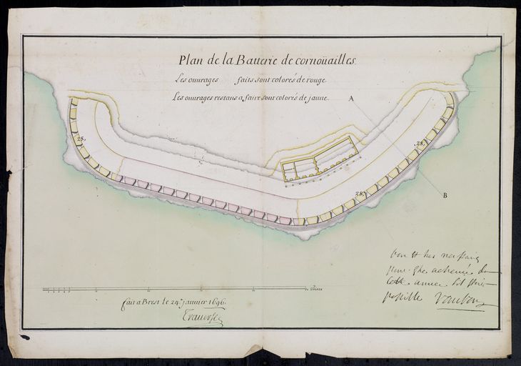 b) La batterie de Cornouaille[s] : 36 embrasures armées de 16 canons de 24 et 20 de 36 (état du 23 avril 1694).