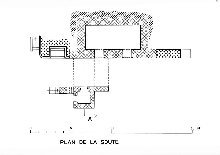 Petite soute à munitions sous roc (repère D du plan) creusé dans le pied de la falaise : accès par tronçon de galerie coudée, pour éviter les coups directs.
