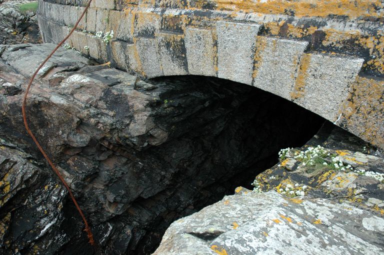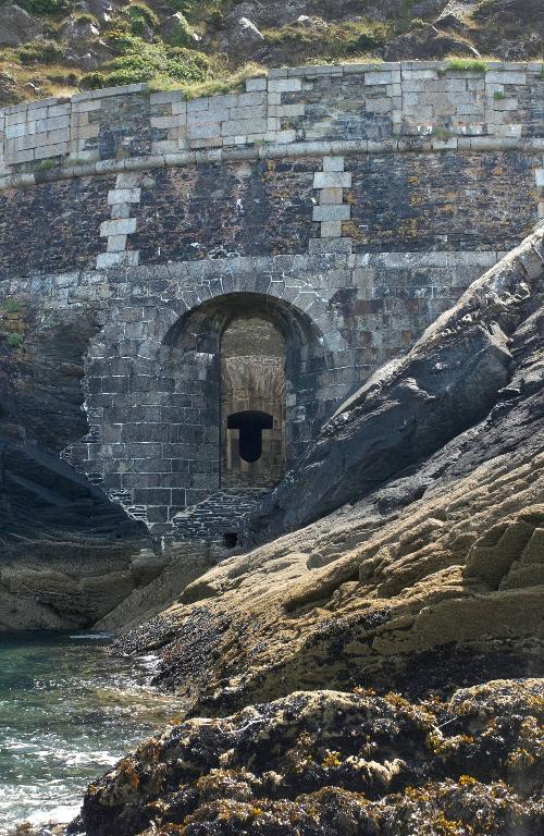 - Pour donner aux casemates une protection verticale suffisante tout en restant le plus bas possible sur l´eau, on a été conduit à creuser la batterie sous la falaise et derrière la batterie basse. Par voie de conséquence, on a pratiqué transversalement dans la plate-forme de la batterie basse deux gorges profondes correspondant au délardement de champ de tir des deux embrasures de 32 cm. Le soutènement de l´escarpe de la batterie basse est rétabli, au droit de chaque gorge, par un arc de décharge formant à la fois ponceau et visière : arc surbaissé à gauche, plein cintre à droite. Ces arcs sont traités avec beaucoup de soin, claveaux et montants en granite appareillé.