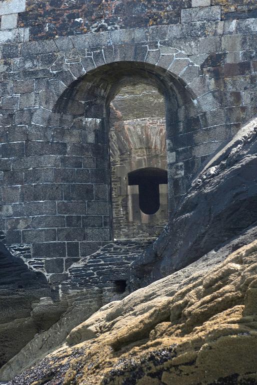 - Intérieur : voûte en briques. Dallage, cheminées, linteaux et montants des créneaux de fusillade, arêtes des voûtes : granite.