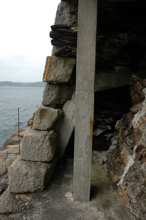 Description : l´ouvrage est constitué par un tronçon de galerie creusé dans la falaise, perpendiculairement à la côte et précédé, à l´extérieur, d´une plate-forme bétonné, initialement à ciel ouvert, où se trouvait boulonné, l´affût du tube lance-torpilles. Le sol de cette plate-forme a partiellement disparu (affouillement).