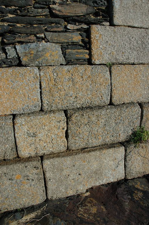 - Encadrement des embrasures, boudin, chaînes d´angle, arêtes interne et externe de couronnement de parapet : pierre de taille de granite clair (gros appareil) soigneusement dressée.