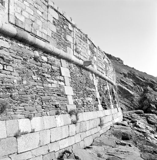 - Le parapet est porté par une escarpe de trois mètres quarante centimètres de haut, avec fruit, reposant sur le banc de roc naturel par l´intermédiaire d´un soubassement en gros appareil (2, 3 ou 4 lits suivant les points considérés). Cette escarpe sert de mur de soutènement au terre-plein de la batterie.