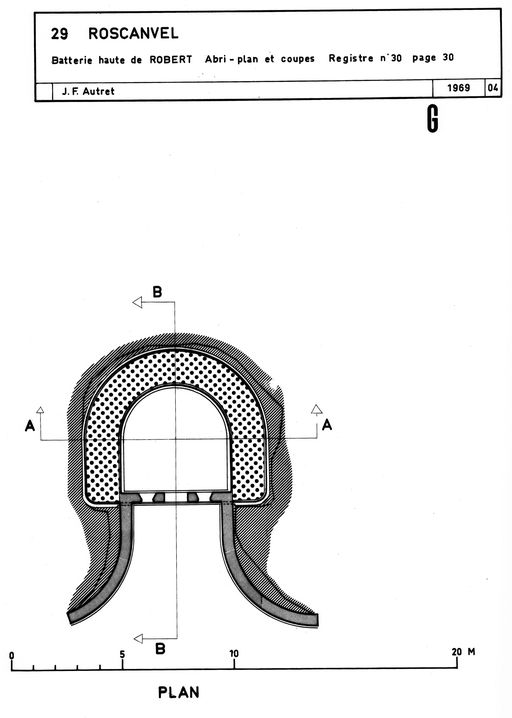 - D´un abri (L) servant d´abri de jour et de combat (25 mètres carrés) pour projecteur de 60 cm monté sur rails et pivotant grâce à une plaque tournante : construction voûtée en moellon et béton armé de 1,5 mètre d´épaisseur. L´accès se fait par un trou d´homme et une échelle métallique.