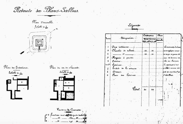 Aux Blancs Sablons, il s'agit pour Vauban de défendre la plage d'une tentative de débarquement... visant l'arsenal et la ville de Brest. Faute de moyens, la fortification commencée en 1689 est dite de "campagne". Reprenant d'anciens ouvrages défensifs, elle se compose essentiellement de palissades, retranchements, batteries de canons et redoutes pour abriter les hommes... Ces ouvrages s'inspirent de plans-types (pour les corps de gardes, les hangars, magasins et retranchements...) et recommandations générales établies par Vauban "commandant de la place de Brest" interarmes en 1694. Les batteries seront composées de terre, fascine et gazon avec de vieux bordages de vaisseaux en guise de plates-formes réparties sur les deux rives du goulet. [...] Derrière et au plus près de chaque batterie, on fera un bâtiment de 8 toises de long et de 3 et demie de large divisé en trois parties : un petit magasin pour la poudre, un hangar pour mettre bragues, palans et armements des pièces à couvert, et un corps de garde. Les redoutes des Blancs Sablons quant à elles sont à rapprocher de celles construites de 1689-1699 sur la côte de la Hougue dans le Cotentin. Les redoutes de Vauban (mises en oeuvre par l'ingénieur Mollart) y compris celles de l'Ilette et de Kermorvan sont conservées et modernisées au 18e siècle mais reconstruites au milieu du 19e siècle sur des modèles-types de 1846. D'autres batteries plus ou moins de campagne (et plus ou moins "temporaires") ont été installées autour de Brest (dans et hors de la rade) sur les directives de Vauban pointe du Renard, Sainte-Barbe, Saint-Mathieu, Guini, Neven, sur l'île Longue, à Plougastel, ou pointe du Corbeau.