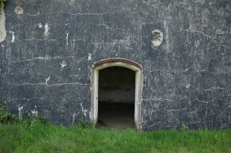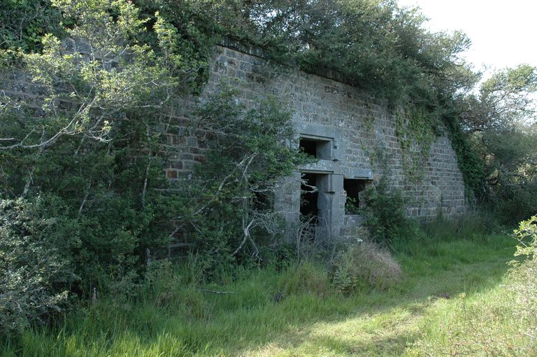 Bâtiment du temps de paix (magasin) en maçonnerie et toiture terrasse à l'extrémité droite, défilé par le massif de terre prolongeant le parapet de batterie.