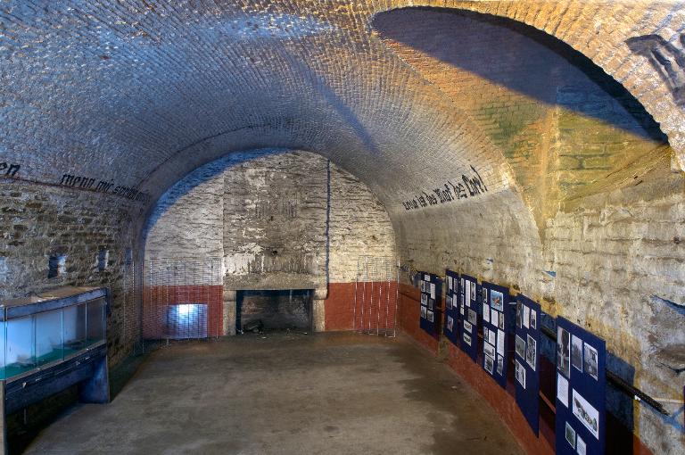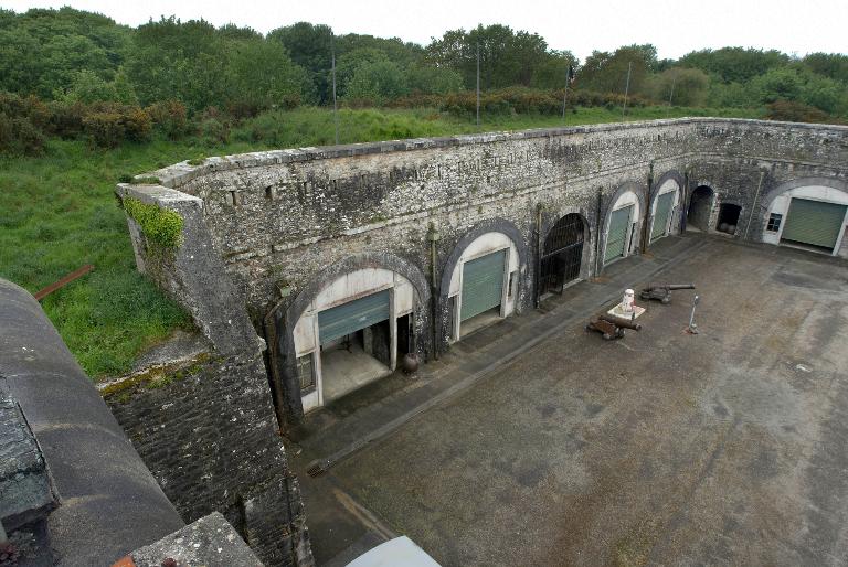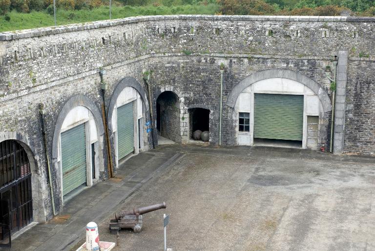 Tout le dessous du cavalier est occupé par de grandes casemates voûtées à l´épreuve de la bombe. La légende du plan des distributions indique l´usage auquel chacune est destinée. En la parcourant, on verra qu´il y a de quoi loger à l´aise 600 hommes et 30 officiers. On y verra de plus un hôpital, une boulangerie, et qu´il reste encore des magasins capables de contenir les munitions de guerre et de bouche nécessaires pour la défense.
