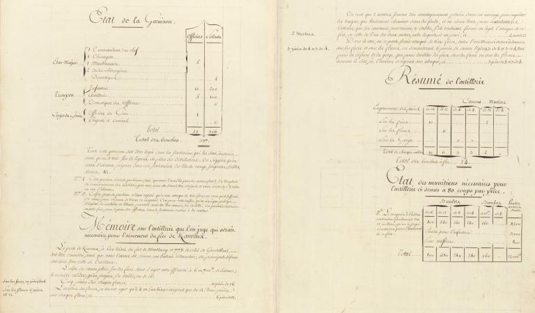 La grandeur de ce fort étant ainsi déterminée par l´étendue du terrain sur lequel il est assis, on a cherché à le mettre en état par les ressources intérieures qu´on y a ménagées, de procurer la plus grande défense avec les 5 ou 600 hommes que la Cour a marqué avoir intention d´y affecter, et en même temps de contenir à l´abri de la bombe cette garnison, avec tout ce qui est nécessaire pour trois semaines de défense.