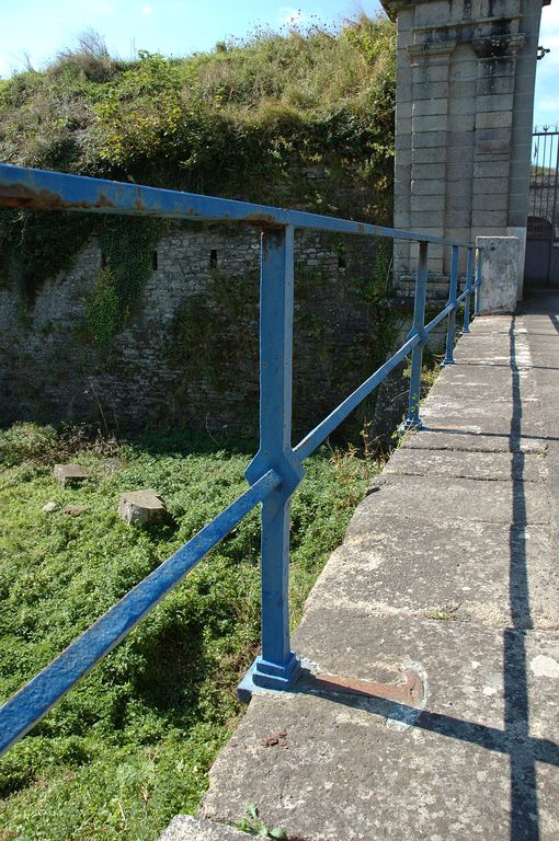 Les deux galeries du front contiennent 30 créneaux, en sorte que, comptant sur deux fusiliers par chaque, on voit que dans la défense il faut y destiner 60 hommes. Cette galerie crénelée n´a pas été continuée le long des faces des demi-bastions, afin de ne pas en affaiblir le revêtement, ces faces dans un siège pouvant être battues en brèche. C´est la même raison qui a empêché de les prolonger dans les branches. On communique à ces galeries du front par un passage sous le rempart, qui prend son entrée dans le souterrain du milieu.