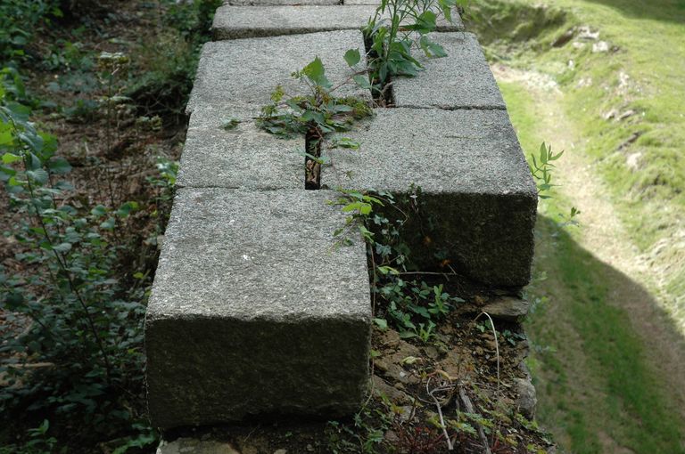 Le front 202, 204 n´a que 140 toises de côté extérieur ; l´angle flanqué du bastion 204 occupe le point le plus élevé ; sa face droite est rampante sur la chute du terrain qui va rendre au fond du vallon du Moulin à Poudre : une partie de 20 toises est terrassée et soutenue sur une pente de 2 pouces, 1 ligne par toise. Le mur de revêtement du reste de la face, ainsi que celui du flanc, est simplement couronné d´un mur crénelé, pratiqué en différents ressauts, la pente étant précipitée et les défenses ne pouvant être que de mousqueterie pour voir sur les revers opposés du vallon. On a commencé une amorce de la courtine, qui doit traverser ce vallon et aller se lier à l´ouvrage de la Carrière du Pape. Sous le terre-plein de cette amorce, on a construit un corps de garde voûté et pour fermer l´ouvrage de ce côté, on a élevé un mur de clôture qui part de ce corps de garde et va rejoindre celui de l´enceinte du port dans lequel on a ménagé une porte de sortie.