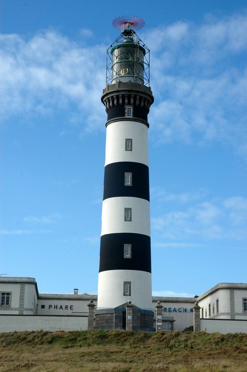- Description architecturale : Hauteur au dessus de la mer : 70 m. Taille générale : 54,85 m. Hauteur de la focale : 50 et 47 m. Description : Tour cylindrique en maçonnerie lisse formant groupe avec divers bâtiments en forme de U. Fût terminé par une console assemblée par des plates-bandes supportant une balustrade à dés. Bandes horizontales noires et blanches sur le fût. Lanterne de deux niveaux. Terrain 5824 m2. - Description technique : 1ère optique : 20 décembre 1863 : feu à éclipses de 20 secondes en 20 secondes avec un éclat alterné avec deux éclats blancs. de 1er ordre focale 0,92 m. Autres optiques : . 4 novembre 1888 : Feu 2 éclats blancs toutes les 10 secondes, électrique, focale 0,30 m. 5 août 1901 : optique Sautter présentée à l' Exposition Universelle de Paris de 1900 : feu à éclats 10 secondes électrifiée de focale 0,30 m. Optique double. 1939 : optiques présentées à l' Exposition Universelle de Paris de 1937 : feu à 2 éclats réguliers blancs 10 secondes. Optique double sur deux étages lentilles de 8 panneaux aux 2/9 de focale 0,65 m. Cuve à mercure : 1901. Combustibles : Huile végétale : 1863. Huile minérale : vers 1875. Aides radio : radiophare. Electrification : 1888. - Etat actuel : Peinture noire et blanche par bandes alternées. Feu blanc à 2 éclats groupés tournants 10 sec. Optique quadruple de 2 panneaux au 2/9 de focale 0,65 m sur deux étages. Lampe aux iodures métalliques de 200W. Portée 32 milles. Vibrateur ELAC-ECAU 2200 sur la roche W du phare.