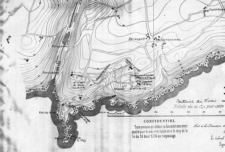 "Afin de rendre le goulet définitivement infranchissable à une flotte ennemie, l´implantation de batteries dites de rupture armées de canons de gros calibre est étudiée dès 1876 par la commission mixte de Défense des côtes. "Le