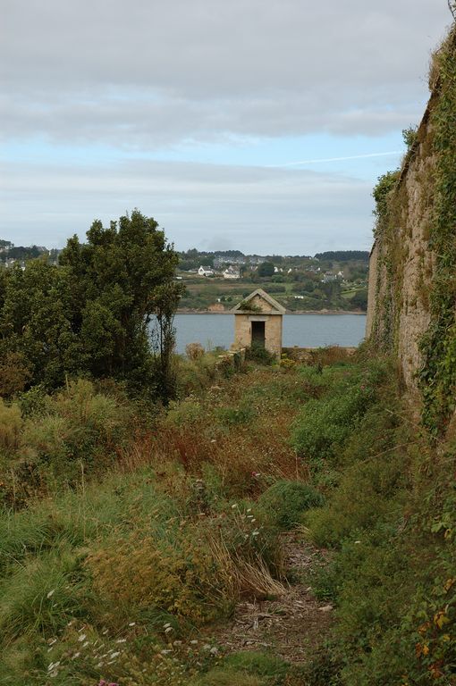 Originalité architecturale, la guérite sud-est, sur deux niveaux, est à double usage : poste d´observation et latrines ! Situé au sommet topographique de l´îlot qui dut être en partie arasé et aplani par les forçats du bagne de Brest astreints à "la Grande Fatigue", chaque magasin voûté en berceau et couvert d´ardoises est long de 48m et large de 17m. Il dispose d´une capacité de stockage sur deux niveaux de 1 040 m². La poudrière centrale semble avoir été moins utilisée que les deux autres, ainsi n´est-elle dotée que d´une seule série de poteaux afin de soutenir le plancher. La face latérale des magasins est contrebutée par douze contreforts. Enfin, deux murs de refends isolent chaque magasin les uns des autres. Par la suite, une porte a été percée dans le mur intérieur ouest de l´enceinte, afin de permettre un accès direct aux trois magasins, et les murs de refends dotés de passages transversaux.