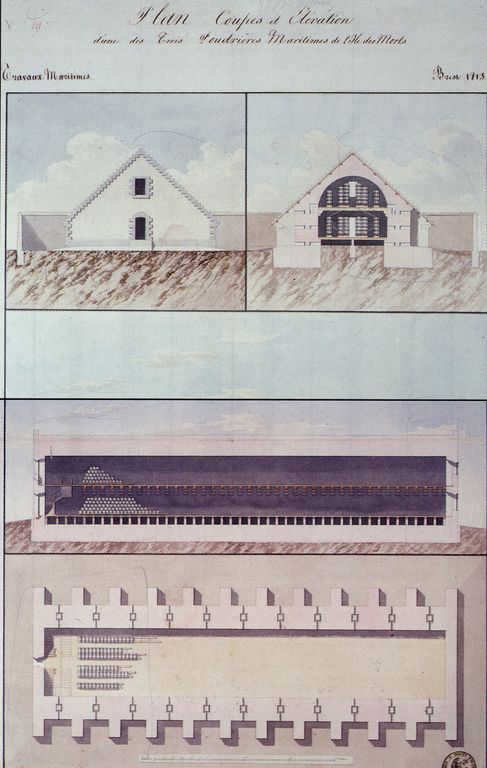 Quelles sont les innovations par rapport au magasin de l´île d´Arun ? Chaque magasin est ici doté d´évents sur trois niveaux et deux escaliers à trois volées droites permettent de desservir l´étage. Mais, c´est surtout dans la disposition du magasin à poudre que réside une évolution majeure : de l´édifice isolé, on passe à un ensemble organisé servant de dépôt et intégrant des notions nouvelles de sécurité par le cloisonnement des espaces. La mise en œuvre soignée, qui fait appel en grande partie à de la pierre de taille en granite (avec remplissage en moellon de grès), les proportions harmonieuses alliées au rythme des ouvertures et à la symétrie de la composition, la rareté de cette typologie dans l´histoire de l´architecture militaire et ici poudrière, font de l´ensemble de l´île des Morts, typique de l´architecture néoclassique du début du 19e siècle, un ensemble remarquable. On pense ici par exemple au logement central en avant-corps ou aux frontons des guérites ou de la lucarne centrale de la caserne de la cale (aujourd'hui masquée par un bardage).