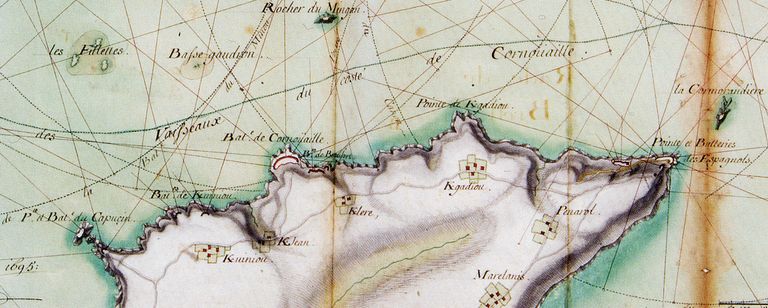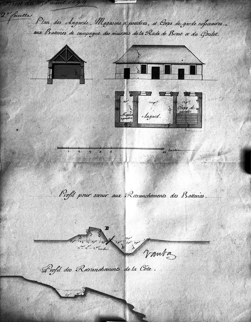 Service Historique de l´Armée de Terre, Château de Vincennes. Archives du Génie. Article 4 : Frontières de France, Section 2 : Frontières maritimes. Paragraphe 3 : Côtes de Bretagne depuis la rivière de Couësnon jusqu´à la baie de Bourgneuf (4 cartons, 1683-1831). Carton 1 : Fortifications de Bretagne, 1683-1759. Pièce n° 1 : 1683. Instruction particulière des batteries de la côte vis à vis du Mengant (fort du Léon) et premièrement de celle qui doit être faite du côté du Léon par Vauban. Pièce n° 4 : 11 juillet 1692. Sur la batterie de Cornouaille par Bouridal. Pièce n° 6 : 1693. Carte de la rade et du goulet de Brest avec les batteries qui en défendent l´entrée et les descentes par Bouridal (Document en mauvais état). Pièce n° 7 : 17 mai 1693. Carte des ouvrages d´une partie du goulet de Brest : pointe des Espagnols, île Longue, Camaret, pointe du Toulinguet par Traverse. Pièce n° 8 : 1693. Plan de la côte des environs du Conquet avec des retranchements pour empêcher les descentes par Renan. Pièce n° 9 : 23 avril 1694. Devis des batteries des environs de la rade de Brest, du goulet, de ses abords, et des retranchements du Conquet, ou sont distinguées les permanentes ou celles qui doivent toujours subsister, des passagères ou celles de campagne qui ne sont proposées que pour un temps. Etat des batteries de la rade de Brest, du goulet, de Camaret et de Douarnenez faites et à faire avec toutes les pièces qui sont dans les batteries et celles qui y sont encore nécessaires et leur calibre. Etat des batteries de la rade de Brest, du goulet, Bertheaume, du Conquet, d´Aber-Wrac´h faites et à faire avec toutes les pièces qui sont dans les batteries et celles qui y sont encore nécessaires avec les calibres de celles qui y sont et celles qu´il y faut par Vauban. Plan des hangars, magasins à poudres, et corps de garde nécessaires aux batteries de campagne des environs de la rade de Brest et du goulet. Profil pour servir aux retranchements des batteries. Profil des retranchements de la côte par Vauban. Pièce n° 10 : 9 mai 1694. Plan du goulet de Brest ou sont représentés le gisement des côtes, les passes des navires, la situation et figure des batteries qui en défendent l´entrée par Vauban. (Trajectoires des tirs de canons mentionnées, à l´est de la batterie de Cornouaille, la batterie de Beaufort, vestiges). Mai 1694. Projet d´un fort proposé sur la presqu´île des Espagnols à côté du goulet de Brest par Vauban. Pièce n° 11 : 5 septembre 1695. Profils des batteries de la pointe des Espagnols à Brest. Plan de la batterie de la pointe des Espagnols à Brest par Vauban. Pièce n° 12 : 23 janvier 1696. Profils des retranchements du Portzic. Plans des batteries et retranchements du Portzic (fort dans sa totalité) par Mollart et approuvé par Vauban. 27 janvier 1696. Profil du nouveau parapet proposé pour la batterie de Camaret. Profil de la batterie proposée sur le rocher isolé de la pointe du Capucin à l´entrée du goulet par Traverse et annoté par Vauban. Pièce n° 14 : 24 juillet 1696. Sur le fanal de Saint-Mathieu. Pièce n° 19 : Sur les feux d´Ouessant et Saint-Mathieu. Pièce n° 24 : cartes des capitaineries garde-côtes de Bretagne. 1734, copie en mai 1735 : Carte de la capitainerie garde-côte de Brest (la 13ème) par monsieur de Quergadiou fils. Elle s´étend de la rivière de Landerneau à l´Aber Benoît. Sont numérotés 34 édifices fortifiés : corps de garde, forts et batteries avec une table des renvois. Pièce n° 25 : Avril 1734. Mémoire sur les entreprises que les ennemis pourraient faire sur plusieurs places maritimes de Bretagne : Brest, Belle-Ile, Houat et Hoëdic, Port-Louis, Port de l´Orient, Concarneau par Dumains. Pièce n° 26 : Avril 1734. Mémoire sur les entreprises que les ennemis pourraient faire sur plusieurs places maritimes de Bretagne : Brest, Belle-Ile, Houat et Hoëdic, Port-Louis, Port de l´Orient, Concarneau, château du Taureau par Dumains. "Les longs intervalles des côtes de Bretagne d´un poste à l´autre depuis la Normandie jusqu´en Poitou ont des corps de garde sur toutes les pointes qui peuvent se répondre par des feux. Pour découvrir les vaisseaux qui arrivent, toutes les anses et descentes sont bordées de retranchements effacées et de petites batteries ruinées qui ne sont pas comprise dans mon mémoire d´estimation parce qu´elles n´ont pas été faites aux frais du Roi mais par corvées de la province. Si l´on prévoyait une guerre prochaine avec les Anglais, il ne faudrait pas plus d´un mois pour les rétablir [...] quoi qu'ils ne peuvent être que mal gardés et d´une petite défense ne pouvant prévoir où les ennemis débarqueront à l´improviste qui pourront faire des courses dans un pays ouvert, brûler quelques petites villes et villages sans oser s´avancer dans la crainte d´être enveloppés et sûres d´être chargés dans le rembarquement s´ils demeurent à terre plus de deux fois vingt-quatre heures [...] ". Pièce n° 28 : 1742. Corps de garde et batteries depuis la baie de Douarnenez jusqu´à Morlaix. Pièce n° 30 : 1744. Mémoire sur les batteries de la côte de Léon jusqu´au château du Taureau. Description, armement. Mémoire sur les batteries de la côte de Cornouaille jusqu´à l´entrée de la rivière de Bénodet par Bigot de Moroguet. Description, armement. Pièce n° 41 : 1747. Batteries des côtes de Bretagne de Brest à Cancale avec leur armement. Batteries des côtes de Bretagne de Brest à Bourgneuf avec leur armement. Batteries des îles Nord et Sud de la côte. Environ 80 batteries du fort du Mengant à l´île des Hébihens. Description de chaque batterie et de leur situation stratégique. Tableau d´état des batteries de canons et mortiers dans toute la côte de Bretagne (Mémoire essentiel à faire dupliquer). Pièce n° 46 : 1755. Défense des côtes de Bretagne par le duc d´Aiguillon.