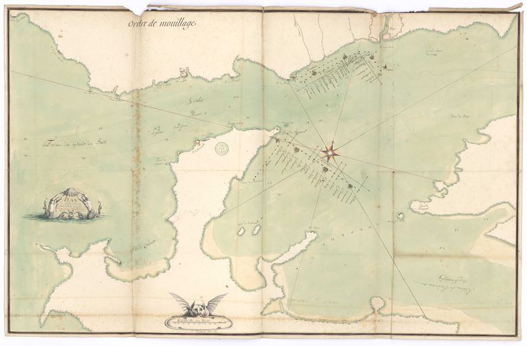 Collection Nivart. MS144_201. Ordre du mouillage de l´armée navale dans la rade de Brest par M. le maréchal de Tourville. Mai 1693.Plan, support papier, 1,187 x 0,837 mètre, 4e quart 17e siècle, 1693.