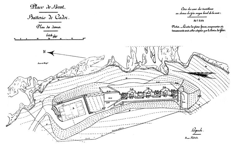Fonction : défense de l'anse de Morgat. Armement des batteries haute et basse de Kador : Le 7 novembre 1844, le comité des fortifications s'appuyant sur le travail de la commission des côtes de 1841 (Atlas de défense des côtes, tome III, 2e arrondissement de Brest) recommande l'armement des deux batteries : 6 canons de 30 livres de balle modèle 1840 sur affût pivotant et obusiers de 22 cm modèle 1827 sur affût de fer pivotant, 2 obusiers de 12 en bronze, 2 mortiers de 32 cm en fer. Les batteries haute et basse de Kador sont mentionnées dans l'Atlas de 1858 de mise en état de défense des côtes de l'Empire Français (n° 230). Classée en 1er degré d'importance, elle est armée de 3 canons de 30 livres de balle modèle 1840 sur affût pivotant, 3 obusiers de 22 cm modèle 1827 sur affût de fer pivotant et 2 mortiers de 32 cm en fer. Selon l'état extrait de la délibération de la Commission de Défense des Côtes en date du 7 février 1870 et annexé au projet d'instruction pour la révison à faire à l'armement du littoral, l'armement transitoire antérieur à 1870 est composé de : 3 canons rayés de 30, 1 obusier de 22 cm lisse, 2 obusiers de 22 cm rayés et frettés et 1 mortier de 32 cm. Selon l'état extrait de la délibération de la Commission de Défense des Côtes en date du 7 février 1870 et annexé au projet d'instruction pour la révison à faire à l'armement du littoral, on préconise comme armement transitoire proposé en 1970 : 2 canons rayés de 27 cm, 2 obusiers rayés et frettés de 22 cm et 1 mortier de 32 cm. Une batterie de 4 canons de 95 mm est mentionnée sur la liste des batteries de côte daté du 1er mars 1904 et 1913.