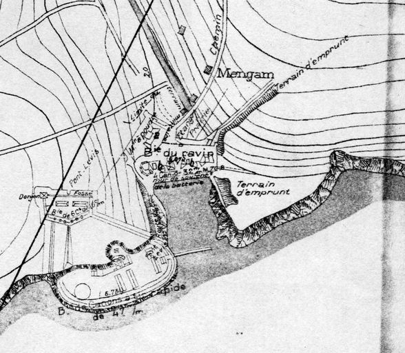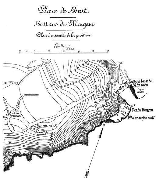 La batterie annexe du Mengant (projetée dès 1888, construite en 1896-1897) dite aussi "batterie de Quillihouarn" (nom du lieu-dit) était armée de 6 canons à tir rapide de Marine de 100 mm modèle 1889 sur affût modèle 1891-T-97 P.A (projectilles : obus en fonte Marine et obus à balle Marine de 14 kilogrammes. Le programme général de défense des côtes du 1er août 1922 et les rapports des commissions locales de réarmement des côtes de Brest et Lorient en 1923 et 1924 (Service Historique de la Marine, 1BB3 180 et 181 : frontières maritimes de l'Atlantique 1923-1924) mentionnent 3 canons à tir rapide de Marine de 100 mm modèle 1889 sur affût modèle 1891-T-97 P.A (batterie haute) et 2 canons de 47 mm (batterie basse).