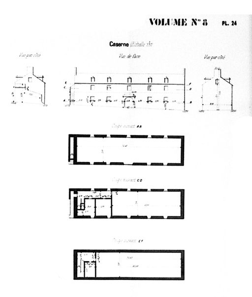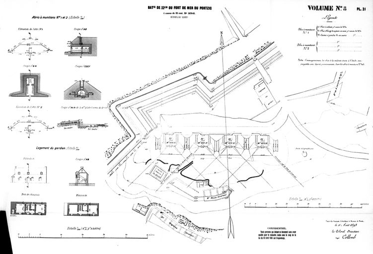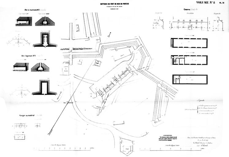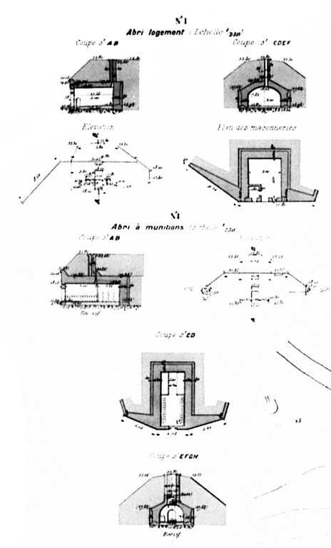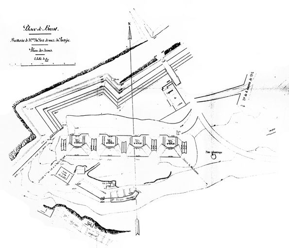Un plan-type de batterie casematée est réalisé à cette occasion sur la base de 2 canons de 32 cm. On y trouve deux chambres de tir avec cheminées d´aération verticales : la casemate et ses deux embrasures en T sont renforcées pour résister au souffle des pièces. Une partie vestibule regroupe en arrière un couloir de circulation doté d´une voie étroite de chemin de fer de 40 cm d´écartement (système Decauville généralisé dans le domaine militaire à la toute fin du XIXe siècle) permettant le transport par wagonnets (poussés à la main) des munitions aux canons depuis le magasin à poudre attenant, un bassin-citerne (pour nettoyer les pièces d´artillerie), une galerie et l´escalier