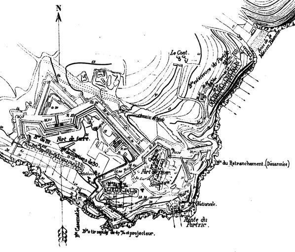 "Afin de rendre le goulet définitivement infranchissable à une flotte ennemie, l´implantation de batteries dites de rupture armées de canons de gros calibre est étudiée dès 1876 par la commission mixte de Défense des côtes. "Le