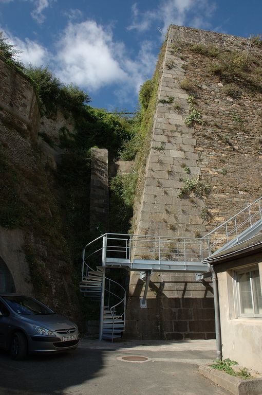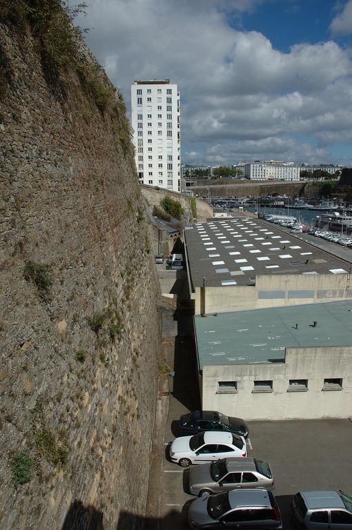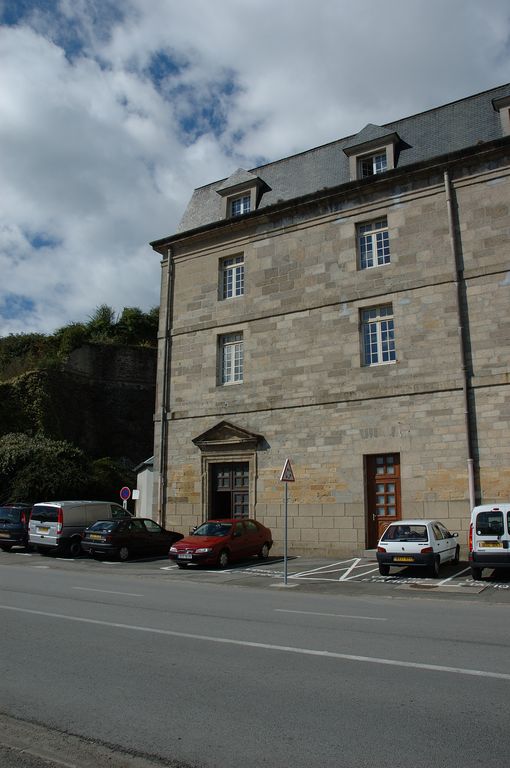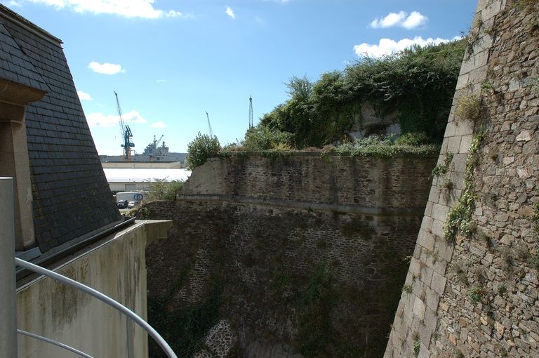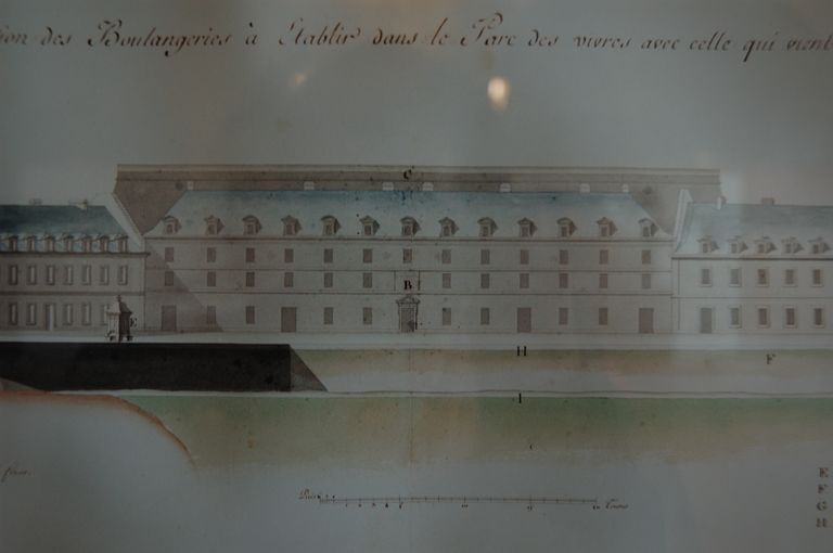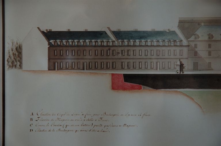 Collection Nivart. MS144_528. Arsenal : plan, profil et élévation du magasin à faire pour les vivres au port de Brest du côté de Recouvrance à la pointe joignant les trois autres. Envoyé à Paris le 24 novembre 1684.Plan, support papier, 0,505 x 0,331 mètre, 4e quart 17e siècle, 1684.