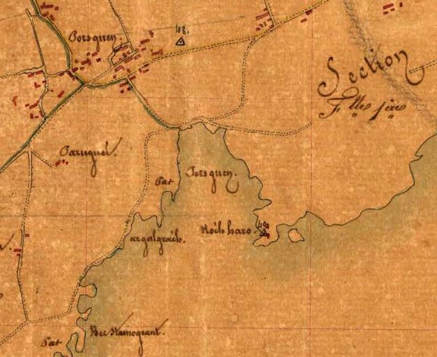 Fonction : défense du mouillage de Roc'h Haro. D'après l'Atlas des côtes de France 1818-1848 (tome 192 : direction de Brest) ; une batterie de côte désignée "batterie de Porsguen" ou de "Roc'h Haro" est mentionnée à l'extrémité de la pointe de "Roc'h Haro". D'après l'état de 1820 et le plan de détail de Paulin, la batterie de Porsguen est dotée d'un "corps de garde pour 4 hommes" et d'une poudrière". Le cadastre de 1842 relève deux éléments défensifs. Le 7 novembre 1844, le comité des fortifications s'appuyant sur le travail de la commission des côtes de 1841 (Atlas de défense des côtes, tome III, 2e arrondissement de Brest) recommande la suppression de la batterie de Porsguen. Par la suite, la batterie cesse d'apparaître dans les états de défense des côtes.