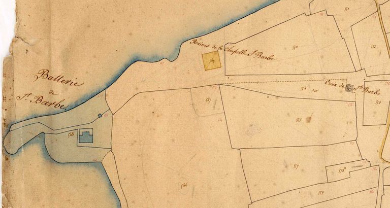 Service Historique de la Défense de Brest : Génie E : 19e siècle. Plans terriers, levers des batteries de côte et plans d´affermage concernant les bâtiments militaires de la place du Conquet. 98 pièces. E 82 (i13) : Batterie de Sainte-Barbe, batterie de Kermorvan