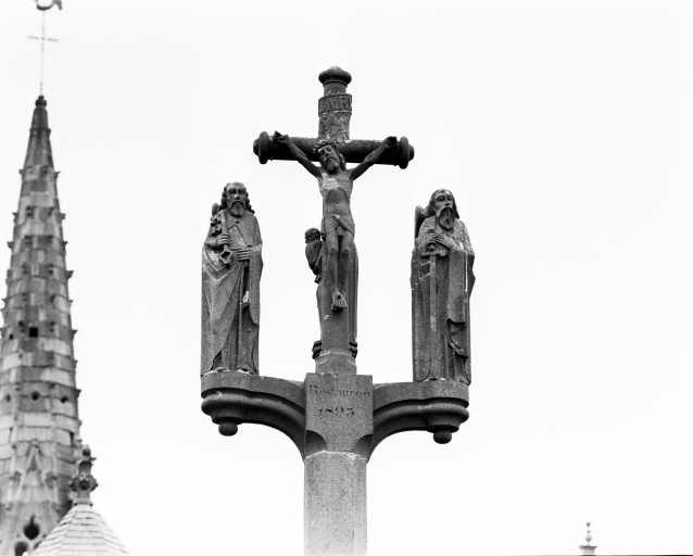 Ce calvaire de village porte sur sa base les noms des commanditaires, prêtres et fabriciens, et la date de 1648. Il figure à son emplacement d'origine sur un plan de 1878. Lors du déplacement et de la restauration intervenus en 1895, on remplace des statues géminées exécutées en 1648 par le sculpteur Roland Doré par des copies ; les originaux ont été remployés dans le monument aux Morts de la commune. La statue de la Vierge à l'Enfant, également l'oeuvre de Doré, est placée dans une niche de l'élévation ouest de l'église.
