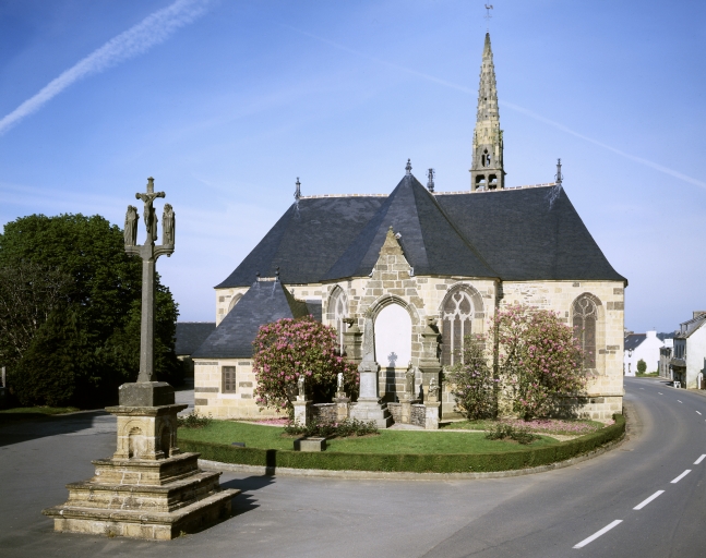 Emmarchement et socle en microdiorite quartzique, calvaire en kersantite. Croisillon portant des statues géminées. Face ouest : saint évêque, Vierge à l'Enfant, saint évêque. Face est : saint Pierre, Christ en croix, saint non identifié. Calvaire remonté à une cinquantaine de mètres à l'ouest de son emplacement d'origine.
