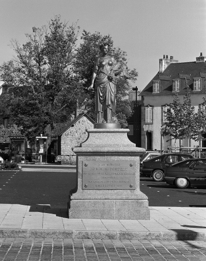 Inscription gravée concernant le destinataire et le commanditaire : A LA MEMOIRE DE M.M. DE POMPERY INITIATEURS EN CE PAYS DU PROGRES AGRICOLE 1830-1880 PAR LEUR FILS ET FRERE EDOUARD COMICE DU FAOU 1884, support : plaque en fonte fixée sur le socle. Statue exécutée par le bronzier Mathurin Moreau en 1883 et inaugurée lors de la fête du comice agricole en 1884. L'oeuvre a été déplacée lors de l'aménagement de la place en 1993, entraînant la suppression de la grille qui l'entourait à l'origine.