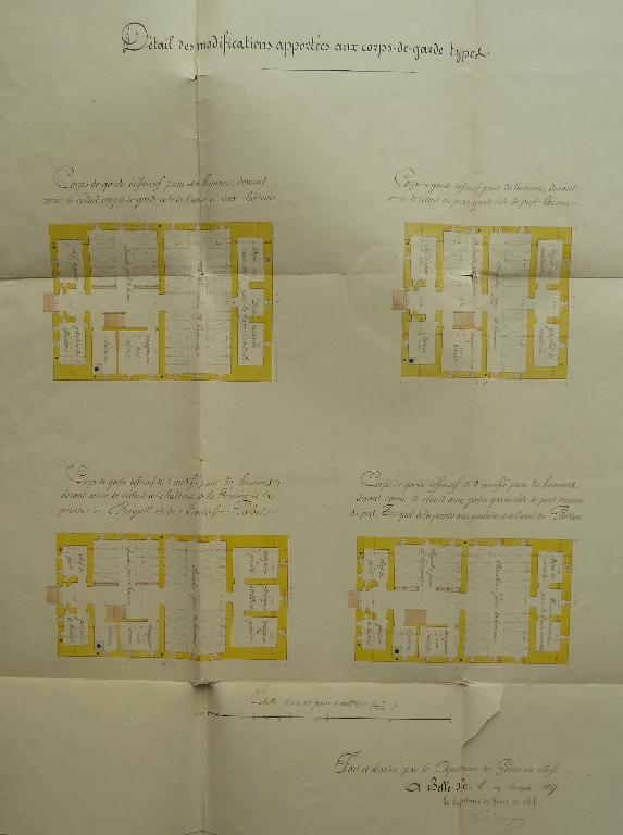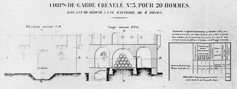 La circulaire du ministre de la Guerre en date du 31 juillet 1846 fixe les plans-types des nouveaux réduits de batterie de côte nommés corps de garde crénelés.