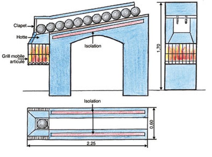 Le Comité constate que les fours exécutés d'après le modèle du général Meusnier, dans différentes dimensions, sont en bon état et efficaces. Pour le futur, il recommande de construire des fours du type Meusnier modifié (fig. 10) qui comporteront un foyer placé dans l'alignement de la sole, un gril décalé au-dessus de celle-ci, avec 2 heurtoirs entre lesquels on pourra placer une dizaine de boulets qui seront chauffés au rouge en une vingtaine de minutes.