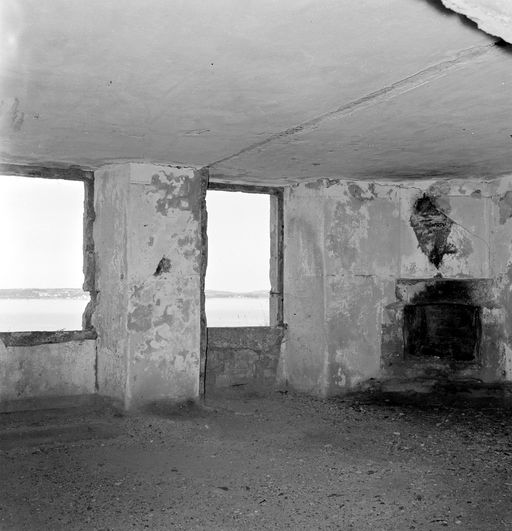 Au-dessus de l'entrée et à gauche, deux fenêtres rectangulaires à montants harpés et linteaux monolithiques de granite donnent jour aux locaux du premier étége, en lieu et place de quatre créneaux de fusillade existant à l'origine (d'après le grand Atlas du début du 19e siècle). Une bombe d'avion a ouvert une brèche dans l'escarpe et démoli la moitié droite du massif de la porte.