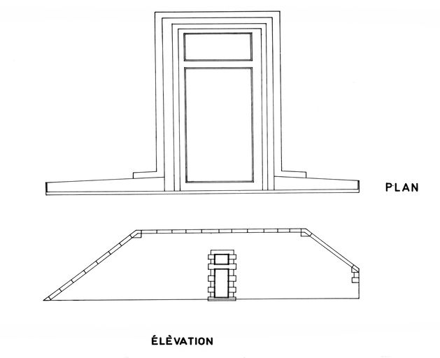 Face Ouest. Seule face restée dégagée de l'ouvrage d'origine, elle se présente à I'extérieur sous forme d'un mur d'escarpe en moellons de granite, avec fruit, couronné d'une tablette. Au milieu, légèrement désaxée vers le nord se trouve, au niveau du sol, la porte d'entrée de l'ouvrage, massif de maçonnerie en saillie sur l'escarpe et dont le dessus s'amortit en cavet. Dans ce massif s'ouvre le passage, en voûte surbaissée du couloir d'entrée. Au-dessus, dans l'escarpe, un petit tableau rectecgulaire porte la date de 1776.