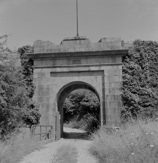 Porte d'entrée : on ne possède, actuellement, aucun détail sur la porte d'origine de l'enceinte. La porte actuelle est datée de 1878 et est en tous points semblable à celle, datée de 1879, construite sur les lignes de l'île Longue [détruites]. C'est un corps de bâtiments dont la façade extérieure, en légère saillie sur le parement de l'escarpe, est entièrement construite en gros appareil de granite gris-beige, soigneusement dressé. Le passage voûté en plein cintre, à claveaux rayonnants, s'ouvre dans une feuillure intéressant les deux tiers de la hauteur de la façade et les trois cinquième de sa largeur. Les parties de façade encadrant ce passage forment ainsi deux montants.