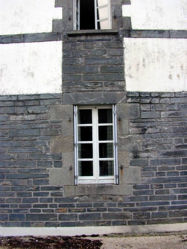 Logis ouest : double en profondeur, gros oeuvre en apparail réglé de schiste pour le rez-de-chaussée et les travées, en kersantite pour le bandeau et la corniche, en moellon enduit pour les autres parties. Logis est enduit, à l'exception des baies, en kersantite. Puits situé à l'angle nord-ouest du logis. Vestiges de murs cernant l'ancien jardin au nord.