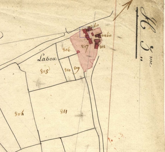 Selon le cadastre de 1812, le village de Labou était composé de deux ou trois exploitations agricoles traversé par un chemin rural. Dans la partie ouest subsistent des murs de clôture au linéaire encore assez conséquent. Les vestiges d'un logis dénaturé portent, sur une pierre remployée, la date de 1699 ainsi qu'un nom, Oli [ier ? ]. Le bâti est inchangé depuis l'enquête de 1970. La partie est du village a été profondémént modifiée. Un grand logis de ferme (17e et 19e siècle), recensé en 1970, a disparu. Il se distinguait par une avancée sur l'élévation postérieure auquel un appentis, en prolongement de l'avancée, fut rajouté après 1812. L'élévation antérieure a été remontée au 19e siècle (différence de gros-oeuvre entre cette élévation, en moellon de granite, et les pignons, en apparail assisé en dalles de schiste), sans doute dans le cadre d'un retournement de façade. Un auvent constitué d'une dalle monolithe en ardoise protégeait la porte d'entrée.