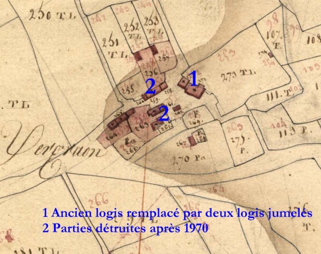 Le cadastre de 1812 fait état d'un hameau composé de plusieurs logis et communs. L'actuel logis double a été bâti en 1865 sur l'emplacement d'une habitation plus ancienne dont pourrait provenir, remployé dans le logis est, un grand charnier (saloir) qui porte la date de 1713 ainsi que le monogramme OP. Un logis à avancée et des communs, repérés lors de l'enquête de 1970, ont disparu à la fin des années 1990. L'enquête de 1970 mentionne l'existence d'un grand nombre de bassins en granite, sans doute en rapport avec la transformation du lin.