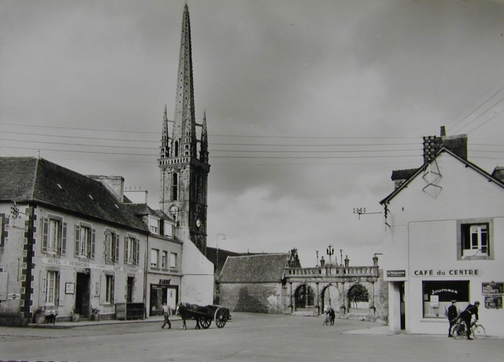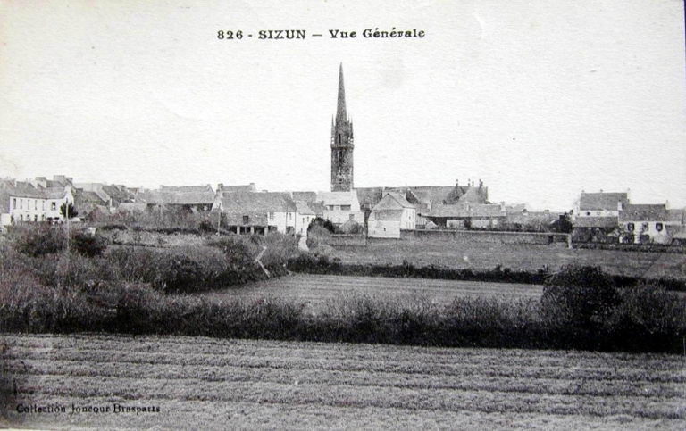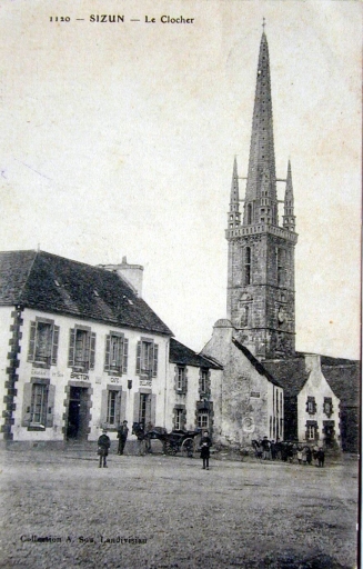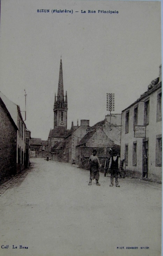 Un premier noyau urbain se met en place à l´époque médiévale puisque la paroisse est attestée dès la fin du 12e siècle. Les éléments les plus anciens conservés ne sont pas antérieurs au 16e siècle (enclos paroissial, vestiges de maisons repérées en 1970). L´agglomération est née autour de l´enclos paroissial, au croisement de plusieurs routes anciennes liant Sizun à Landivisiau, Landerneau et Brest au nord et à l´ouest, à Huelgoat et Carhaix à l´est ainsi qu´au sud du département (Le Faou, Quimper). Cet emplacement stratégique et l´essor de l´industrie toilière aux 16e et 17e siècles influent sur le développement du tissu urbain qui, sans doute fixé dès cette époque, demeure, au coeur du village, globalement inchangé. Les échanges commerciaux (toiles et surtout chevaux) se déroulaient, en absence de halles et au moins dès le 17e siècle autour de l´église et plus particulièrement sur la grande place (actuellement place Charles de Gaulle). Cette structure héritée du passé apparaît sur le cadastre de 1812 : l´agglomération spontanée sur plan radioconcentrique enferme sept îlots au sein desquels les maisons occupent les fronts de parcelles et donnent directement sur l´espace public (rues, places ou chemins), alors que les jardins sont situés à l´arrière. Au milieu du 19e siècle, ce chef-lieu de canton compte parmi les bourgs les plus actifs du département, notamment à cause de ses nombreuses foires (bovins, moutons, chevaux, denrées alimentaires, outils). Témoin de ces activités, le poids public, ouvrage permettant de vérifier la contenance et le poids des matières et animaux vendus, subsiste au nord de l´église. L´expansion du bourg s´amorce à partir du milieu du 19e siècle, avec la construction d´une nouvelle mairie (vers 1845), l´agrandissement du champ de foires (1865), la construction d´établissements scolaires et d´une gendarmerie. Le transfert du cimetière a lieu entre 1868 et 1871. Peu de chronogrammes ont été relevés : 1730 (16, rue de l'Argoat), 1821 (1, rue de l´Argoat), 1836 (13, rue de l´Argoat), 1860 (rue de Cornouaille), 1870 (6-8, rue du Docteur Corre), 1913 (1, place Charles de Gaulle). Un grand nombre de maisons, au moins une vingtaine, était pourvu d´escaliers extérieurs marqués sur le cadastre de 1812 ; beaucoup ont disparu entre 1850 et 1950 et actuellement, une seule subsiste au 2, impasse Keranroux. Une importante vague de reconstruction de l´habitat a lieu entre la fin du 19e siècle et la guerre 1914-1918 ; elle affecte la quasi-totalité des maisons autour de l´église qui sont entièrement ou partiellement reconstruites ; pour les façades à trois travées, le recours à la kersantite pour l´encadrement des portes et des fenêtres est fréquent. A la même époque, les terrains longeant la route de Commana (actuellement rue de l´Argoat) commencent à être bâtis, joignant alors des secteurs auparavant ruraux comme Menez Sizun. La construction de la gendarmerie marque aussi la progression du bourg dans ce secteur. L´entrepreneur et conseiller général Paul Charreteur, maire de Sizun entre 1900 et 1919, y fait construire sa propre demeure et ses ateliers (rue de l´Argoat) tout comme un ensemble de logements destinés aux ouvriers de son entreprise (allée des Ajoncs). D´autres demeures de notables ont été repérées au 46, rue de l´Argoat (maison d´un notaire) et aux 6 et 8, place Charles de Gaulle ; la demeure entourée d´un jardin clos de murs construite pour le docteur Pierre Mazé, à l´origine isolée, est aujourd´hui entourée d´un lotissement (dit de Vergraon). La ligne de chemin de fer départemental d´intérêt local liant Plouescat à Rosporden atteint le sud du bourg en 1912 (transport de sables, engrais, bois, ardoises, bétail, voyageurs). L´arrivée du train entraîne la construction d´un établissement hôtelier (Grand Hôtel des Monts d´Arrée) ; ce bâtiment, construit en 1912 par l´entrepreneur Paul Charreteur, existe toujours alors que la gare, située sur la place devant l´hôtel - l´actuelle rue de l´Elorn suit l´ancien tracé de la voie ferrée - a disparu après l´arrêt de l´exploitation de la ligne de chemin de fer en 1934. Un lavoir public couvert est construit en 1921 à la sortie sud du bourg. Durant l´époque de l´entre-deux-guerres et suite à la loi Loucheur facilitant l´accès à la propriété populaire, la construction pavillonnaire apparaît à Sizun, notamment le long des voies existantes (route de Commana, rue de Brest, rue de Poul Ar Ranet). La maison située à l´angle de la place Charles de Gaulle et de la rue de Cornouaille (actuellement pharmacie), porte l´empreinte du style néo-régionaliste des années 1930. D´autres lotissements voient le jour entre les années 1960 et aujourd´hui : le secteur de Vergraon près de la rivière de l´Elorn, à l´est du centre bourg entre la rue de l´Argoat et la rue du Moulin Neuf et au sud de Kerroch.