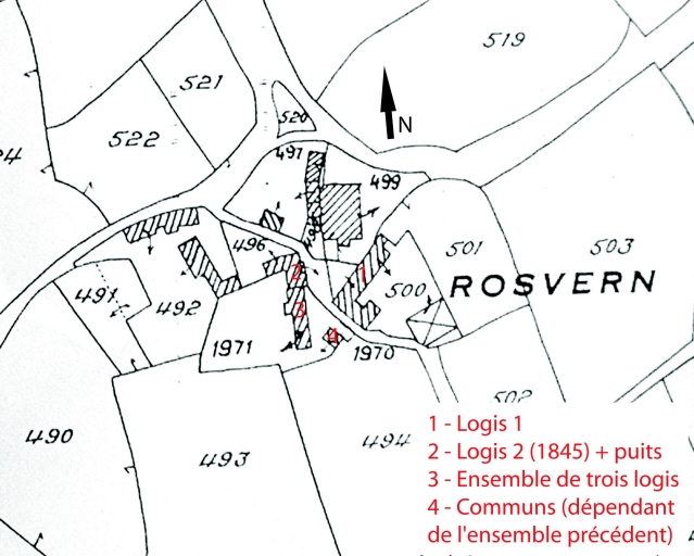 Présence d'un puits carré et couvert qui dépend du logis 2. Logis 1 de type ternaire. Logis 2 (1845), à avancée (à étage et toit en bâtière). Ensemble de trois logis de type ternaire dont un à avancée sur l'élévation postérieure.