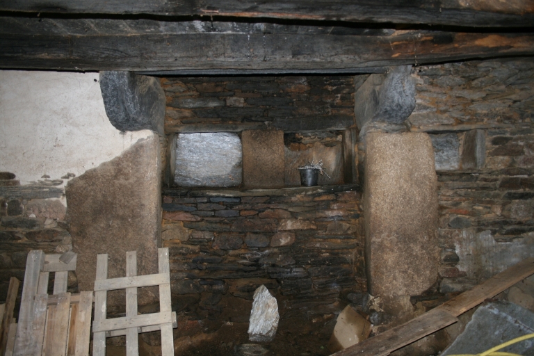 Le logis 2 : à avancée de taille réduite (rajout tardif ?), cheminée monumentale avec piédroits monolithes en granite, corbelets et linteau en schiste. Une pierre en schiste de la souche de cheminée porte l'inscription IHS.