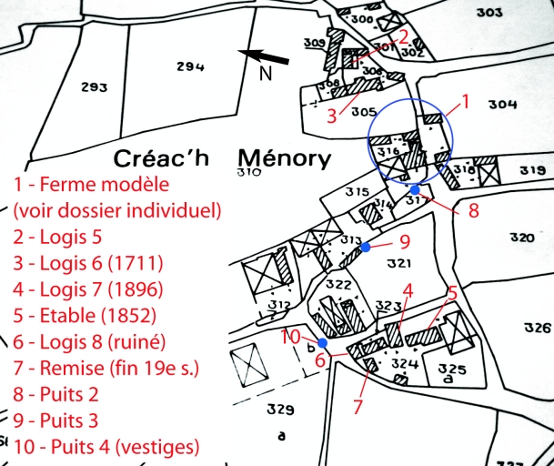 Logis 6 : disparition d'un escalier de distribution extérieur donnant accès à l'étage ; une pierre insérée dans la maçonnerie de l'avancée porte la date de 1711, une croix et l'inscription IHS. Dans la partie sud-ouest du hameau, on voit encore l'emprise au sol d'une ancienne soue à cochon de plan circulaire à l'origine couverte de genêts.