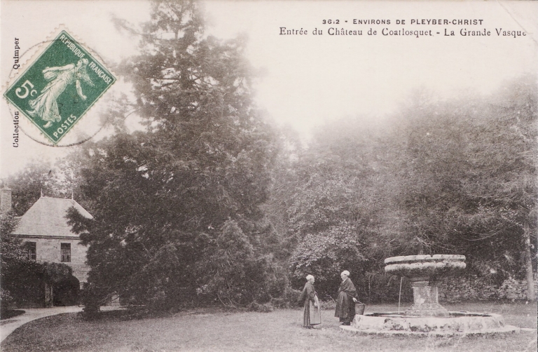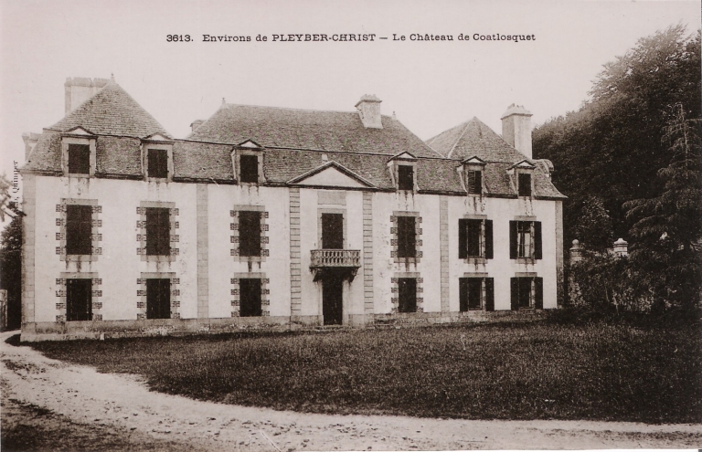 Situé à la lisière nord-ouest d´un vaste territoire boisé, le domaine seigneurial de Coatlosquet appartient, entre le 14e et le 18e siècle, à la famille du même nom. D'un manoir attesté en 1448, rien ne semble subsister. Le domaine est entièrement réaménagé entre la fin du 17e et le milieu du 18e siècle : construction ou reconstruction du logis seigneurial (remanié aux 18e et 19e siècles) et du pavillon d´entrée surmonté d´un logement et flanquée d´écuries, aménagement des jardins en terrasses, mise en place des systèmes hydrauliques (vasque avec bassin de fontaine, miroir d´eau ou vivier). L'ancienne chapelle dédiée à saint Nicodème est attestée en 1703 ; aujourd´hui sans toiture, elle conserve le réseau une baie plus ancienne et une crossette sculptée figurant un moine (16e siècle ?). Maudez Le Bris, maître maçon et "architecte" de Sizun (1646-1727), travaille au manoir en 1722 (ancien logis ? pavillon d´entrée et écuries ?). Le colombier figurant sur le cadastre de 1837 a disparu vers 1920. Une aile en retour d'équerre située au nord-ouest a disparu après 1837. Le grand bâtiment au nord-ouest, en cours de reconstruction, existait en 1837 ; flanqué d´un escalier extérieur et pourvu d´un escalier intérieur (18e siècle ?), il abrite un grand bassin en schiste et une cheminée monumentale, aménagements qui laissent supposer qu´il s´agit d´une ancienne buanderie (lieu du rouissage et du blanchiment du lin) utilisée par la suite comme lavoir. En mauvais état depuis la seconde Guerre Mondiale, le logis a disparu en 1963. Les jardins (murs de soutènements, piliers, escaliers) ont été restaurés.