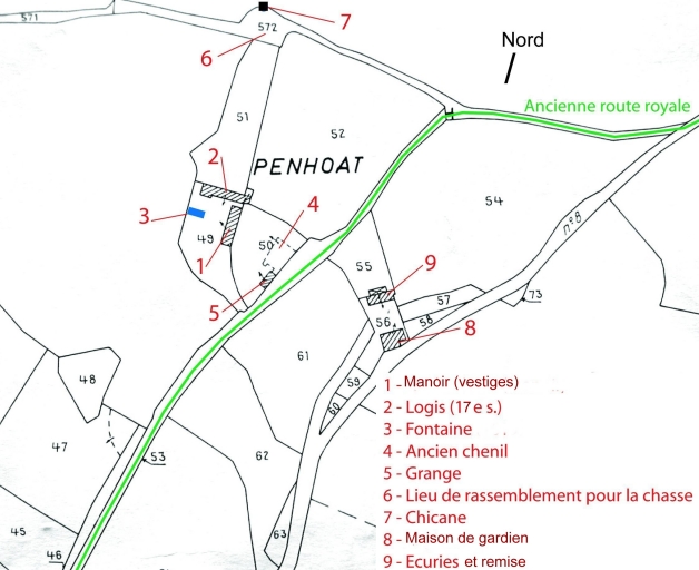 Le lieu est habité en 1481 par Alain Le Scanff, noble. Les vestiges d´un logis (rez-de-chaussée du manoir) semblent remonter à cette époque. La fontaine monumentale et la porte d´accès à la cour portent la date de 1619. C´est probablement durant la seconde moitié du 17e siècle, après le déclassement du manoir, qu'un nouveau logis est élevé à l´ouest. Il n´est pas clairement établi s´il s´agit d´un projet inachevé modifié par la suite ; la partie nord a été reconstruite au 19e siècle à l'emplacement d'un corps de bâtiment existant en 1837. Les communs au nord (ancien chenil, grange) datent du 19e siècle. Liant Carhaix à Saint-Pol-de-Léon et Roscoff, l'ancienne route passant à proximité des bâtiments fait partie du domaine depuis son détournement intervenu vers 1900. Le domaine englobait plusieurs fermes et métairies dont Kermorvan ainsi que la chapelle Saint-Divy. Le parc d´agrément a été créé vers 1865 (introduction d´espèces végétales rares). La maison de gardien et les écuries (pierre de remploi datée 1700), associées à une remise, pourraient dater de la fin du 19e siècle. Les allées bordées de murets de granite, le lieu de rassemblement pour la chasse et la chicane pour compter les chiens de meute figurent sur le cadastre de 1837 mais pourraient être plus anciens. Le manoir, ses abords et l´allée de hêtres font partie d´un site classé (arrêté du 14/03/1946). Depuis 1988, les bâtiments, la fontaine monumentale et l´environnement végétal font l´objet d´une préservation et d´une restauration minutieuses ; la partie nord du logis ouest a été récemment reconstruite à l'identique suivant le projet initial supposé. Depuis 1992, Penhoat figure dans le pré-inventaire des jardins remarquables du Finistère.