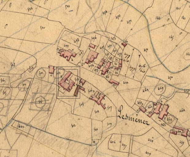 Ensemble de deux corps de bâtiments abritant habitation et lieu de travail probablement construits au 17e ou au 18e siècle pour un fabricant et marchand de toiles. L'ensemble, à l'origine bien plus vaste comme en témoigne le plan cadastral de 1837, a perdu une importante aile en retour d'équerre au sud. La grange portant le millésime 18 (?) 4, l'écurie et le logis moderne datent respectivement du milieu ou de la fin du 19e siècle et des années 1945-1950. L'existence d'une buanderie antérieure à 1837 et aujourd'hui disparue prouve le traitement du lin au sein du hameau.