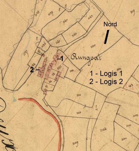 Une buanderie disparue mais connue par les archives atteste l'ancienne activité toilière du lieu. Les deux logis retenus (18e siècle) ont été remaniés plus tard. Le logis 2 a fait l'objet d'un relevé schématique montrant une division en deux logements intervenue assez tôt comme semble en témoigner le mur de refend auquel s'adosse un charnier. La trace d'un escalier extérieur disparu sur l'élévation postérieure plaide en faveur d'un retournement de façade et du rajout de l'avancée intervenus sans doute avant 1837 puisque l'avancée figure sur le premier plan cadastral. Baies modifiées au 19e siècle.