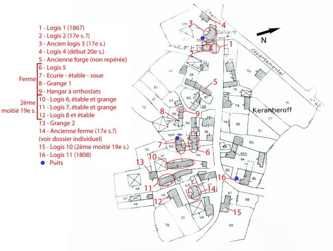 La structure du hameau n'a que peu évolué depuis 1835. Composé de cinq ou six noyaux, regroupant une ou plusieurs unités agricoles organisés de part et d'autre d'un chemin de desserte, le village s'est étoffé entre ces noyaux dans la seconde moitié du 19e siècle. Bon nombre de logis anciens ont été détruits entre 1950 et 1970. De même, beaucoup de logis anciens ont été transformés au 19e siècle, puis au 20e siècle. Certains, très dénaturés, ne sont plus lisibles. Logis 2 et ancien logis 3 probablement du 17e siècle. La ferme, regroupant le logis 5, écurie, étable, soue, grange et hangar à orthostats, existe déjà en 1835 et date probablement de la première moitié du 19e siècle. Logis 11 (construit pour Pierre Grall et Marie Le Bo) et 1 datés respectivement 1808 et 1867. Logis 6, 7, 8 et 9 avec dépendances, de la seconde moitié du 19e siècle. Logis 4 du début du 20e siècle.