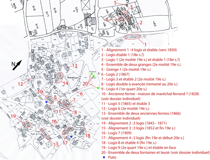 Etable 1 : Ancien logis-étable (à porte unique) du 18e siècle, déclassé en dépendance. Alignement 1 : quatre logis (ou logis-étable à porte unique : intérieurs non vu) et une étable. Alignement 2 : trois logis (deux à deux pièces et un à pièce unique). Alignement 3 : deux logis à deux pièces et un logis-étable. Alignement 4 : deux logis de type ternaire. Logis 7 : type ternaire avec éléments de décors sur la façade principale (bandeau formé de pierres taillées en losange et deux têtes de chevaux sculptés sur le linteau de la porte et inscriptions "FONDEE EN 1909 BL"), enduit disparu.